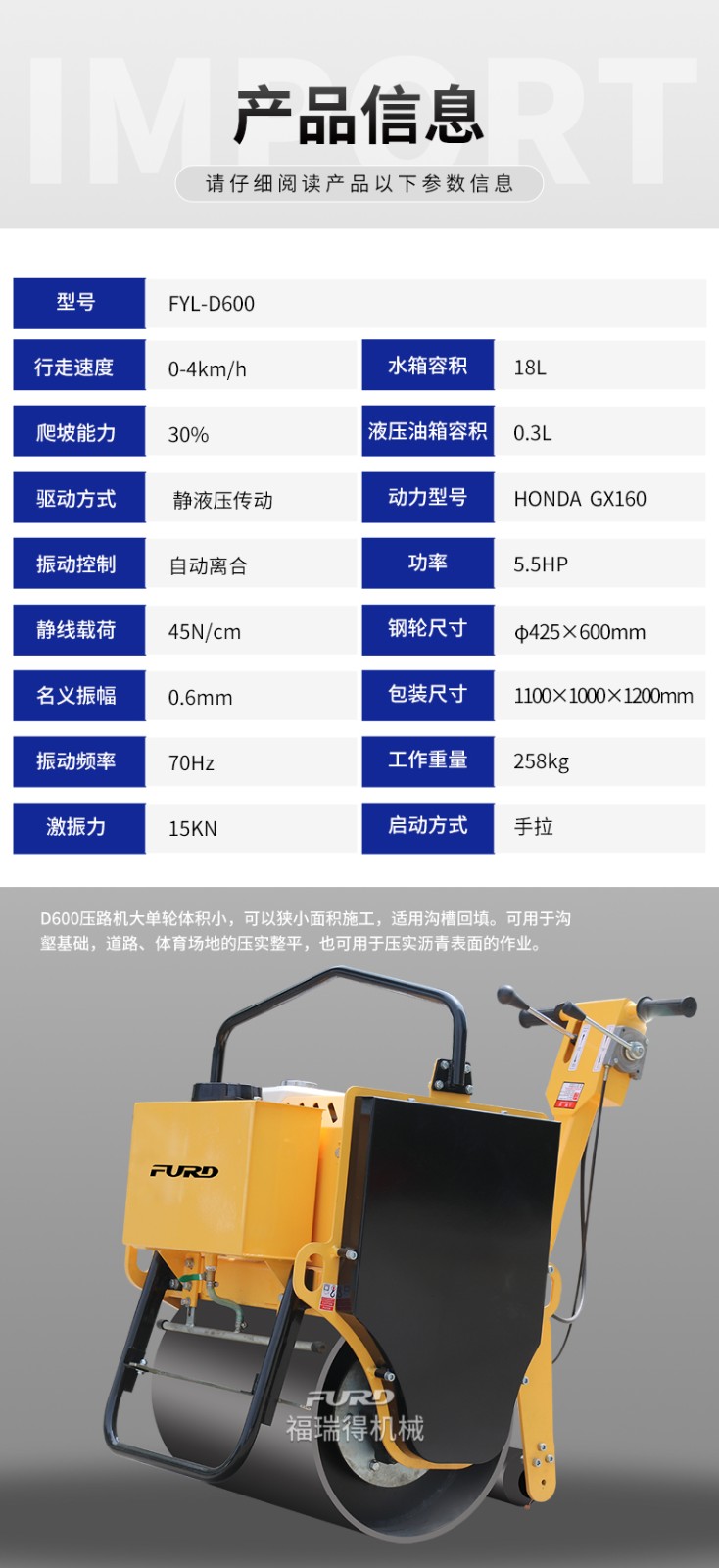 產(chǎn)品名稱:FYL-D600進口液壓系統(tǒng)手扶壓路機