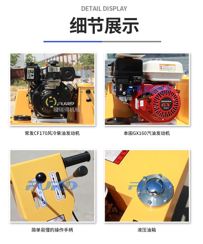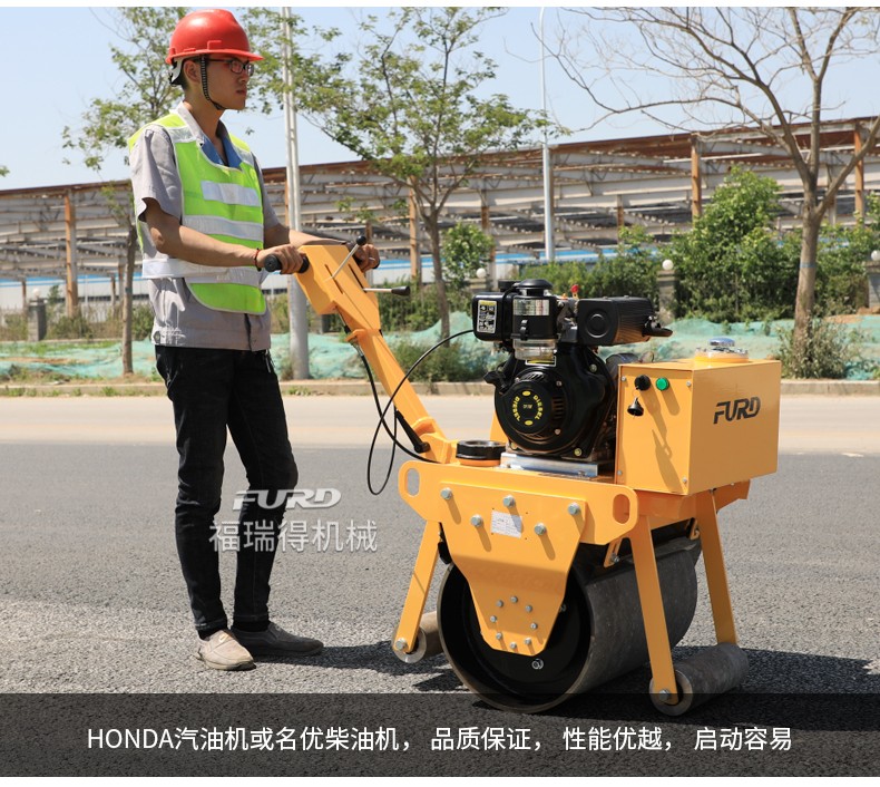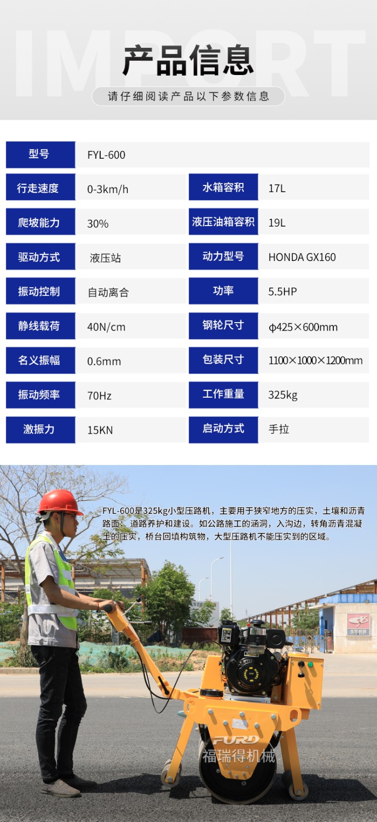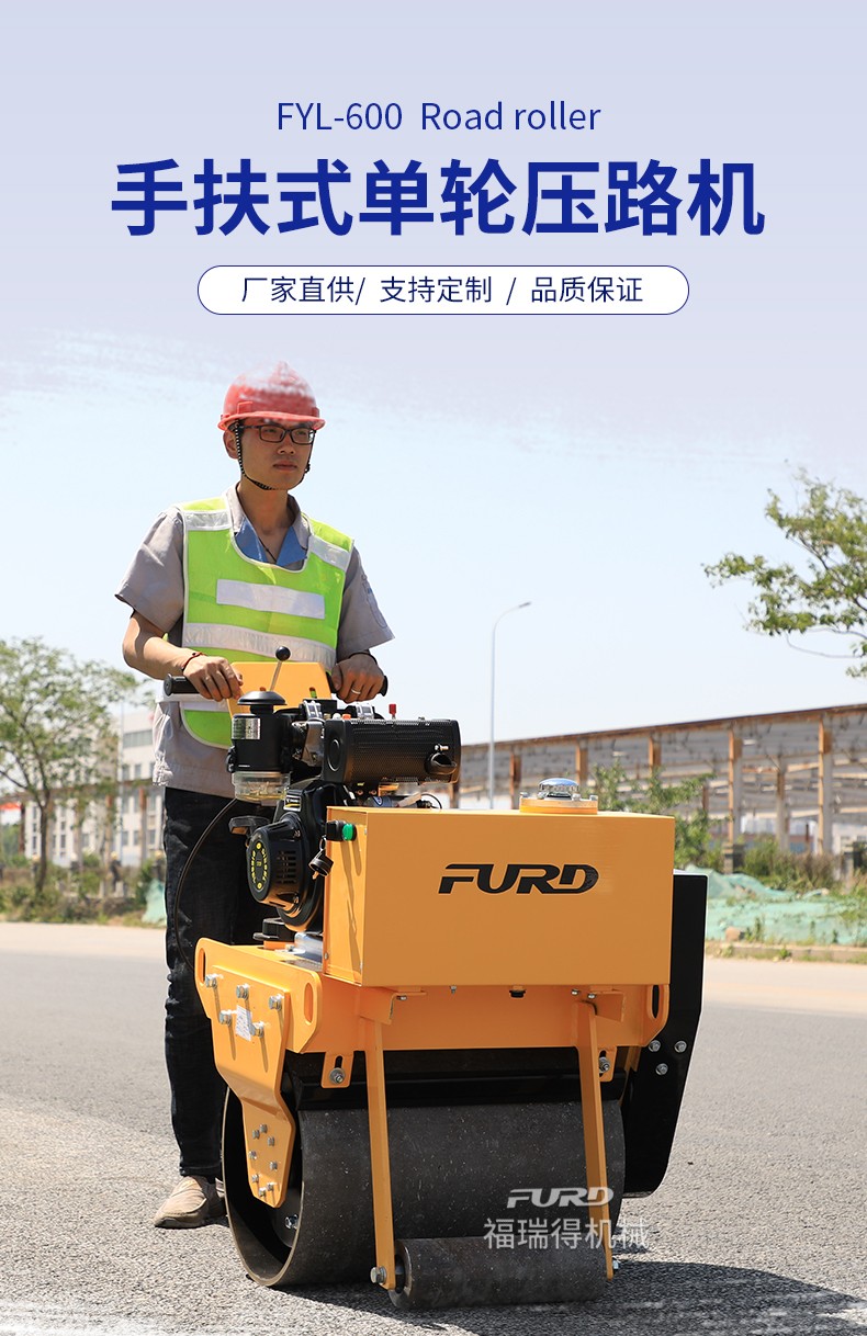 產(chǎn)品簡介:FYL-600 汽油單輪壓路機主要用于溝渠基礎(chǔ),道路,體育場地的壓實整平, 也可用于壓實瀝青表面的作業(yè)。